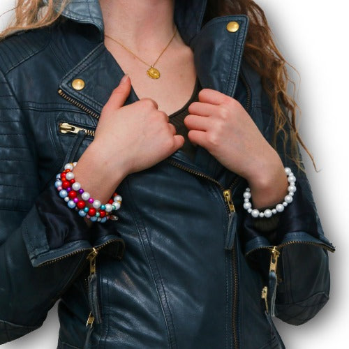 Each bracelet, crafted with 10mm Disco Beads with 6mm in betweenies, handstrung on super stretchy elastic, fits wrists up to 16cm perfectly. They're great for layering or as standalone pieces.