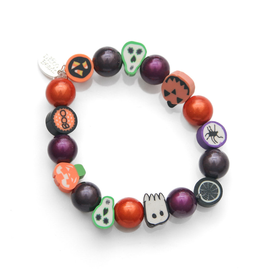 Ghost, pumpkin, spider and other fun characters with Orange, Gunmetal and Purple  Fine  Disco Beads.  Add a little fun to your Halloween with these unique bracelets!