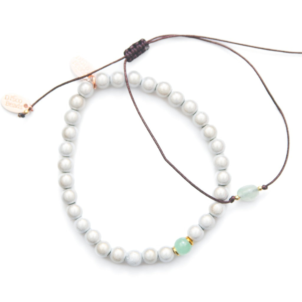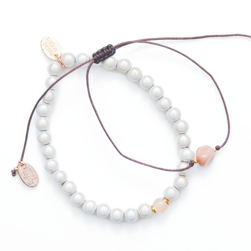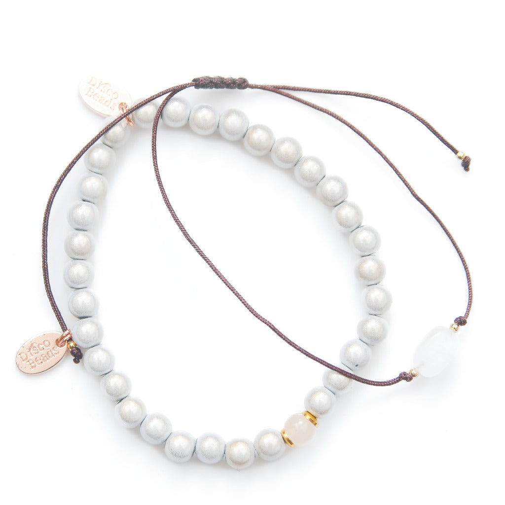 These beautiful bracelet sets have been made using our most popular 6mm Super Fine beads in Snow qith a centrepiece Crystal with a gold bead cap. These have been paired with a simple corded bracelet with matching Crystal centrepiece. Both have a Rose Gold jewellery tag.