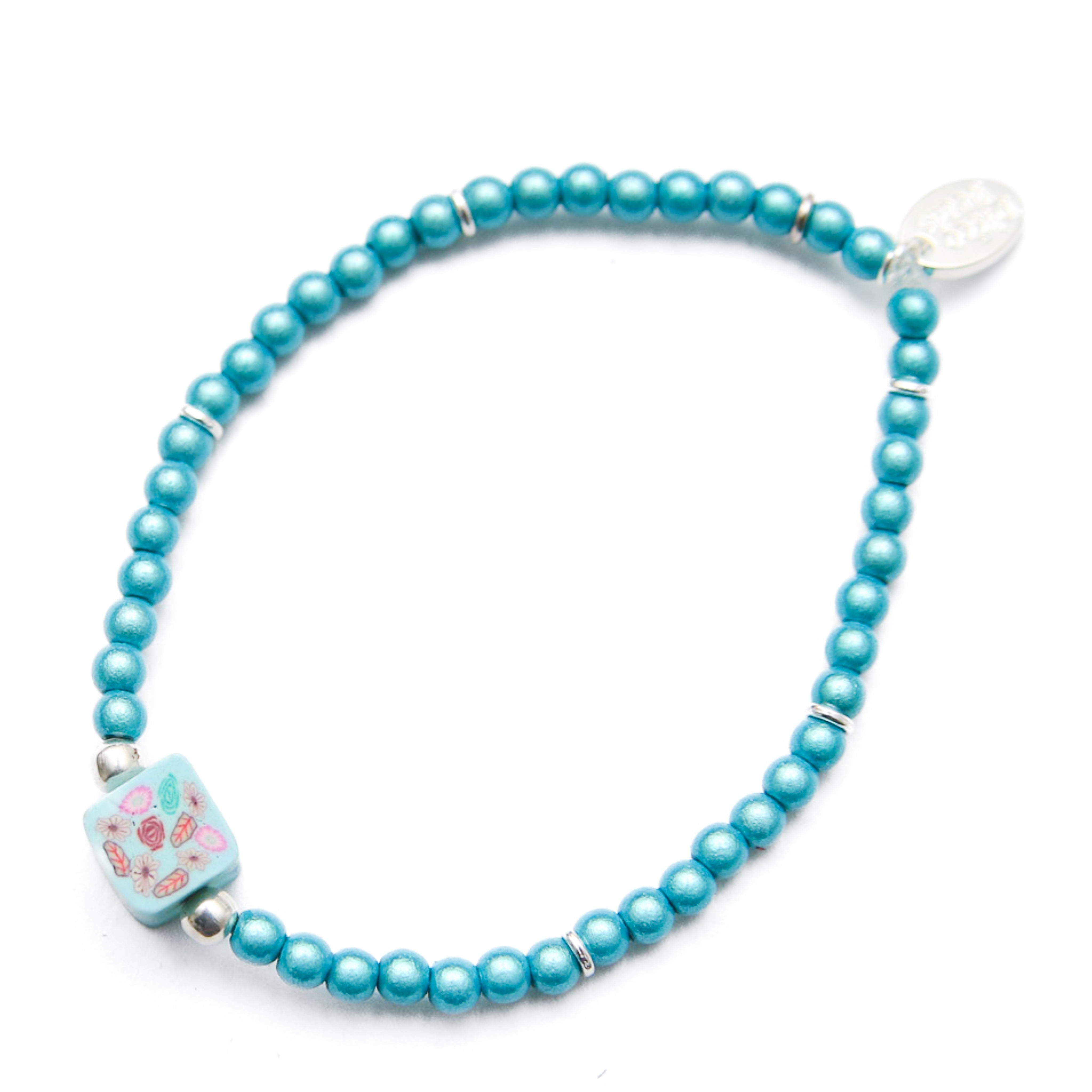 These beautiful Bracelets feature Ultra Fine Disco Beads in soft pastel colours with a simple Fimo Bead centrepiece, either square or round, in complimentary colours. Silver metallic glints are spaced throughout.